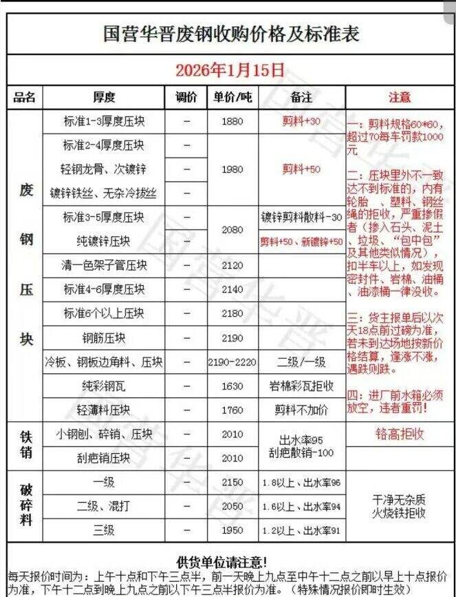 2026年1月15日國營華晉廢鋼收購價格及標準表