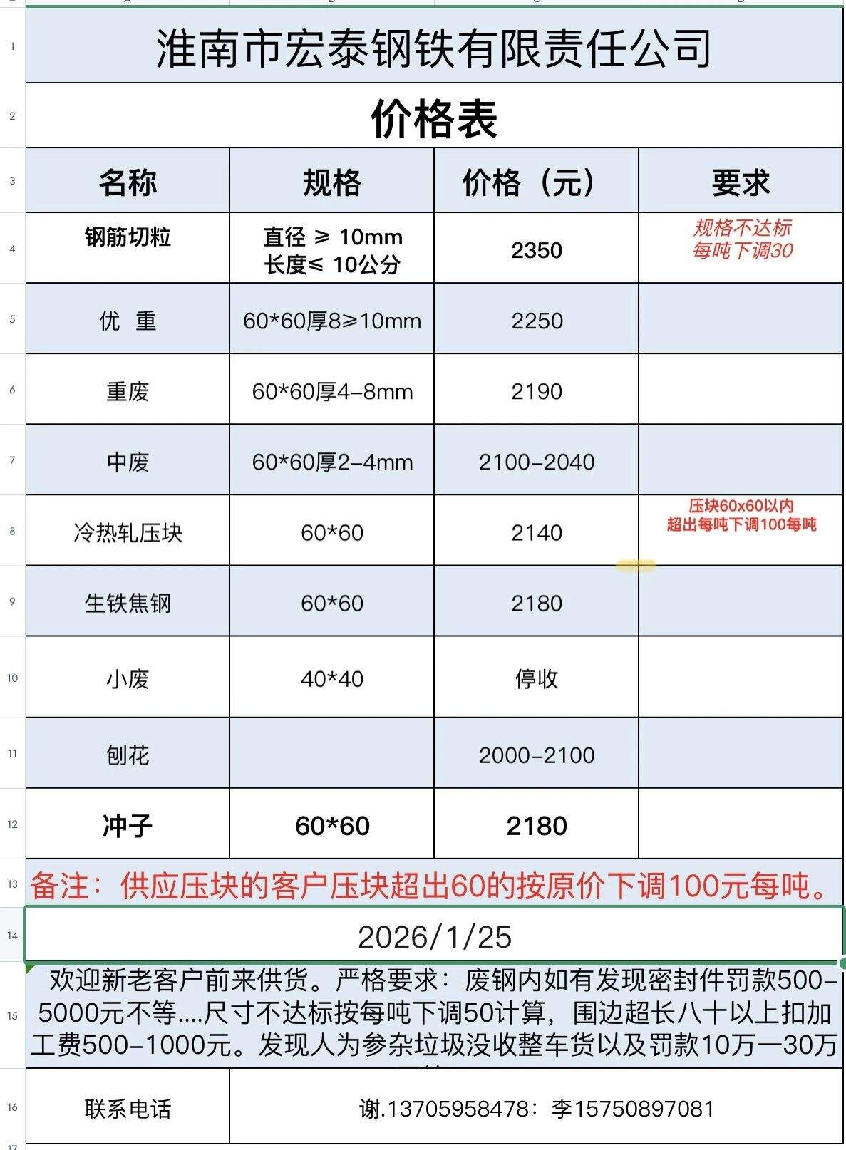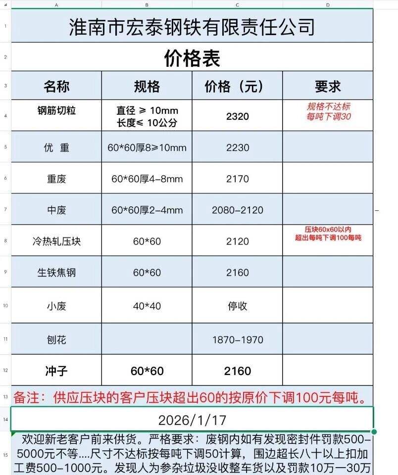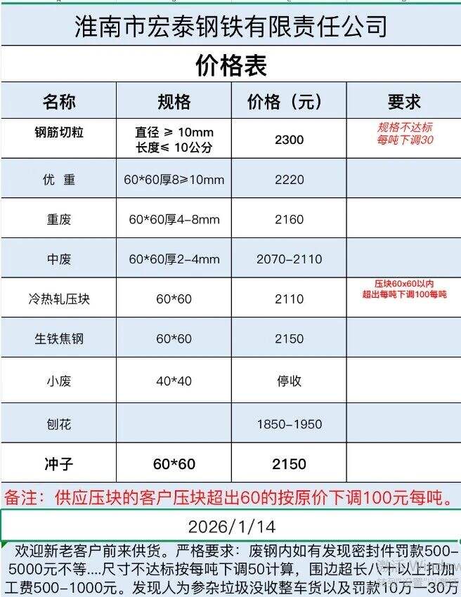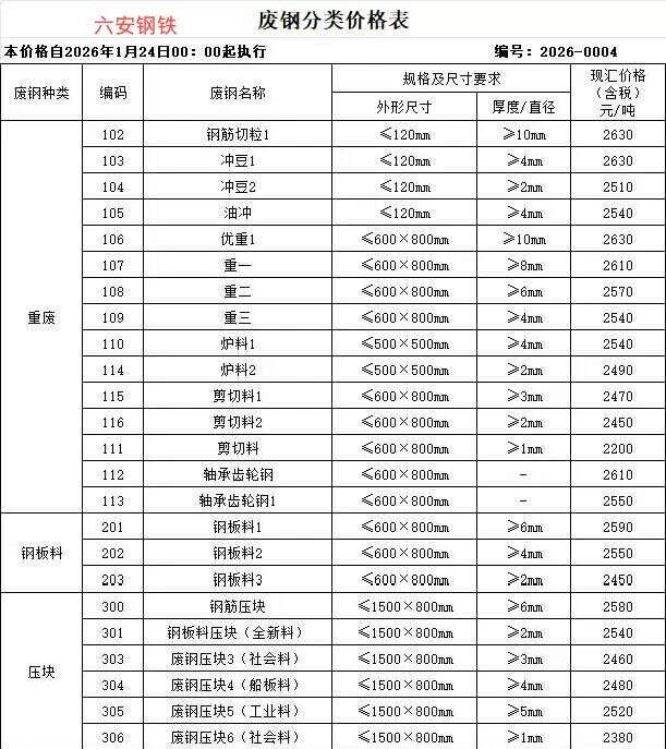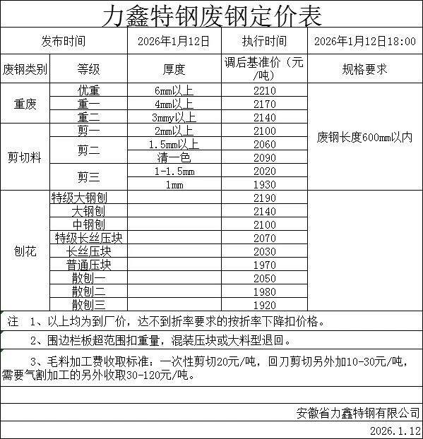 **日安徽力鑫特鋼收購價(jià)跌**:重廢****-****,剪料****-****,刨花****-****具體參考報(bào)價(jià)單,不含稅。