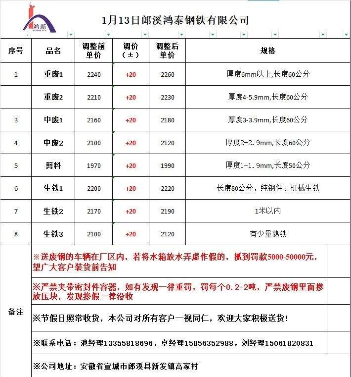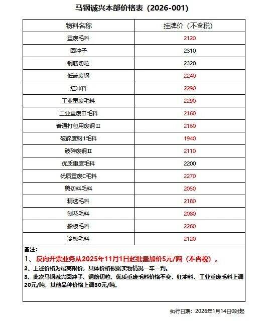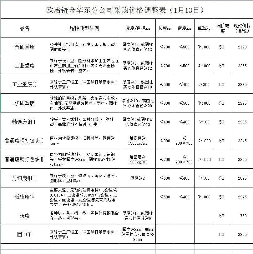 *月**日*時(shí)起,此次馬鋼誠興圓沖子、鋼筋切粒、優(yōu)質(zhì)重廢毛料價(jià)格不變,紅沖料、工業(yè)重廢毛料上調(diào)**元/噸,其他品種價(jià)格上調(diào)**元/噸。