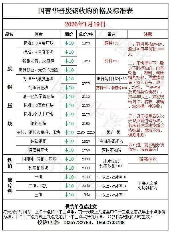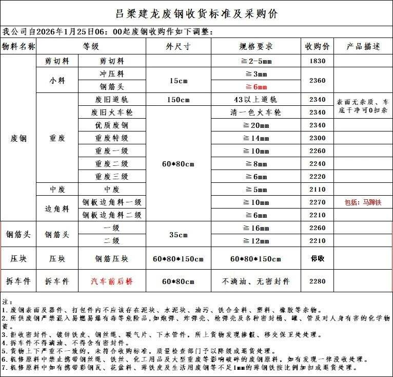 山西華鑫源鋼鐵集團(tuán)通知:****年*月**日*時(shí)起,廢鋼各料型下調(diào)**執(zhí)行以下價(jià)格: