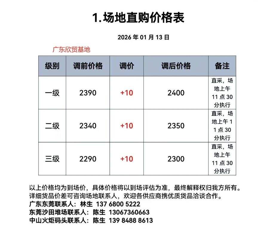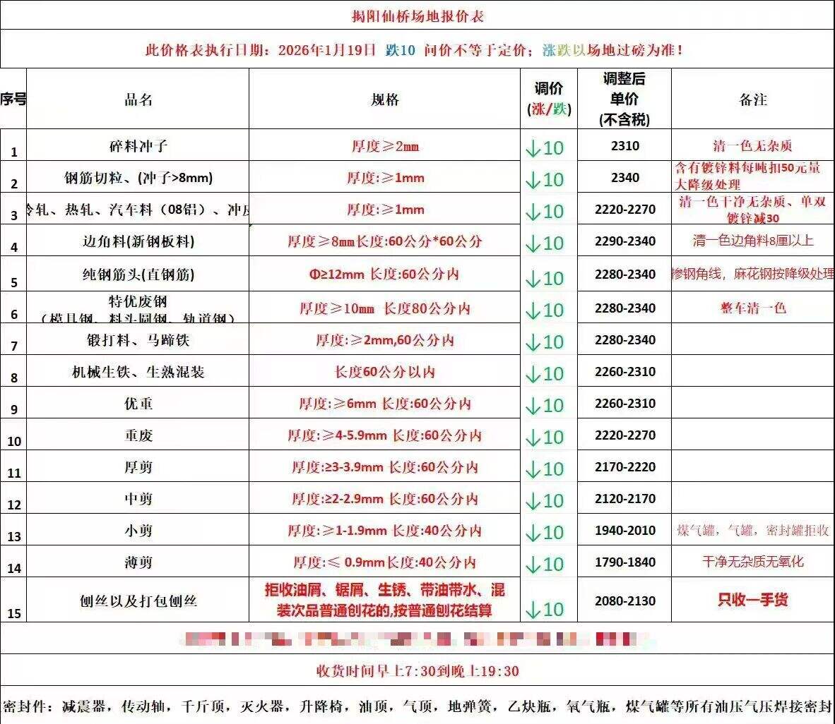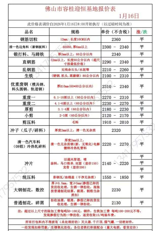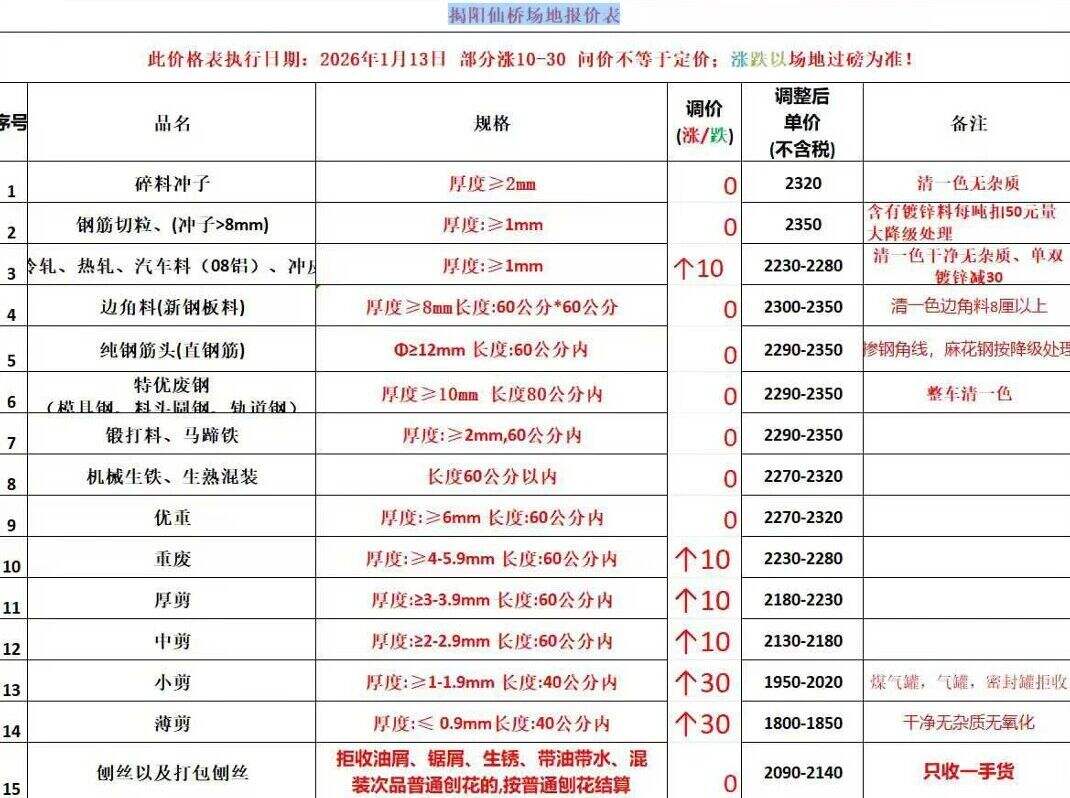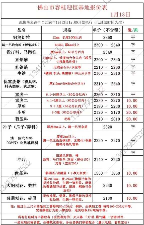 廣東欣貿(mào)基地廢鋼調(diào)價(jià)通知價(jià)差標(biāo)準(zhǔn)明細(xì)表不變。詳見(jiàn)價(jià)差明細(xì)表編號(hào):XMGD-**-**直采,場(chǎng)地所有料型統(tǒng)一上調(diào)**元,上午**:**分執(zhí)行。(以上調(diào)價(jià)內(nèi)容僅針對(duì)廣東區(qū)域)****年**月**日。