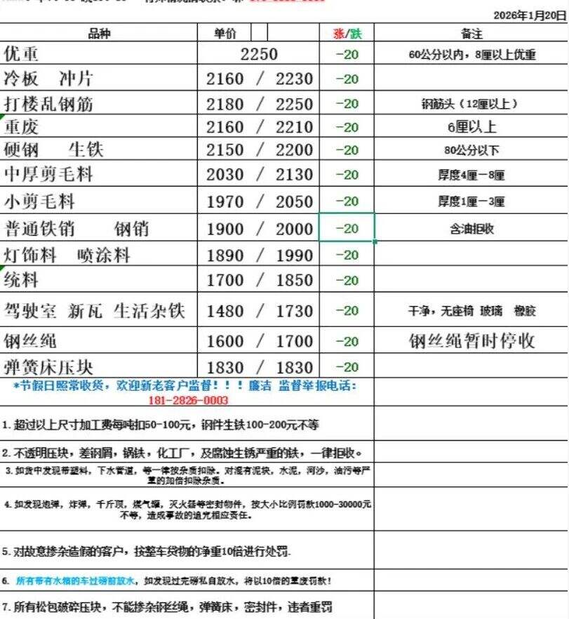 廣東欣貿(mào)基地廢鋼調(diào)價(jià)通知價(jià)差標(biāo)準(zhǔn)明細(xì)表不變。詳見(jiàn)價(jià)差明細(xì)表編號(hào):XMGD-**-**直采立即執(zhí)行,場(chǎng)地所有料型統(tǒng)一下調(diào)**元,下午**點(diǎn)整執(zhí)行。(以上調(diào)價(jià)內(nèi)容僅針對(duì)廣東區(qū)域)****年**月**日。
