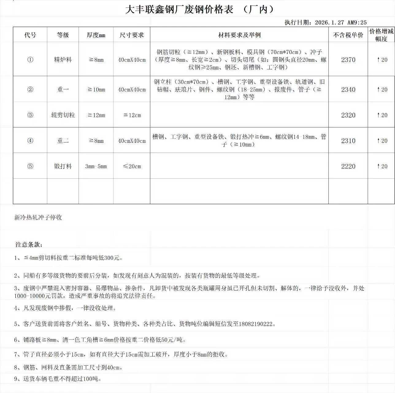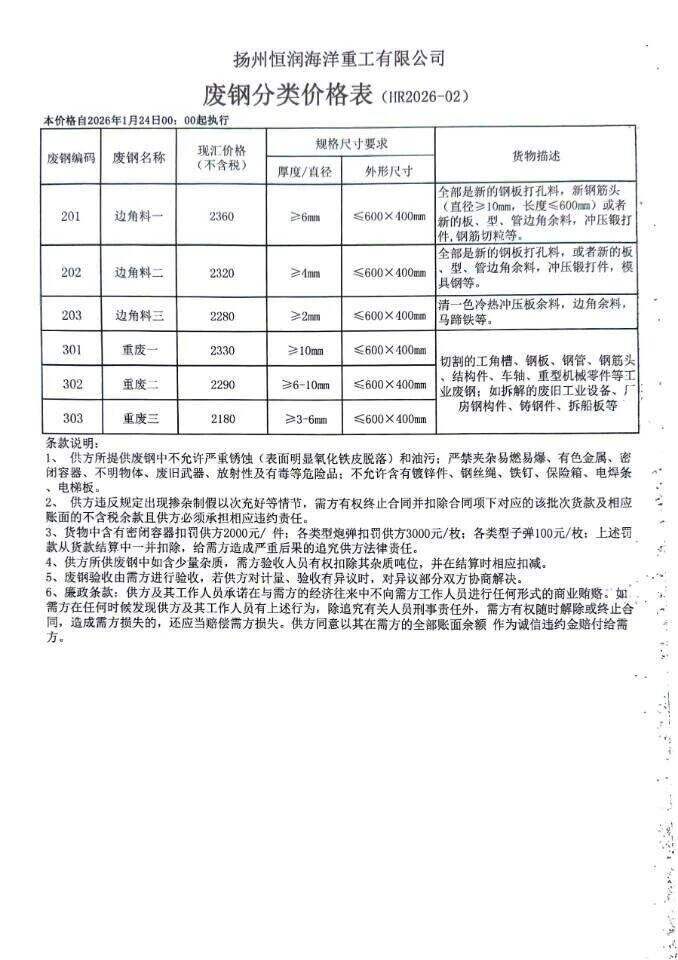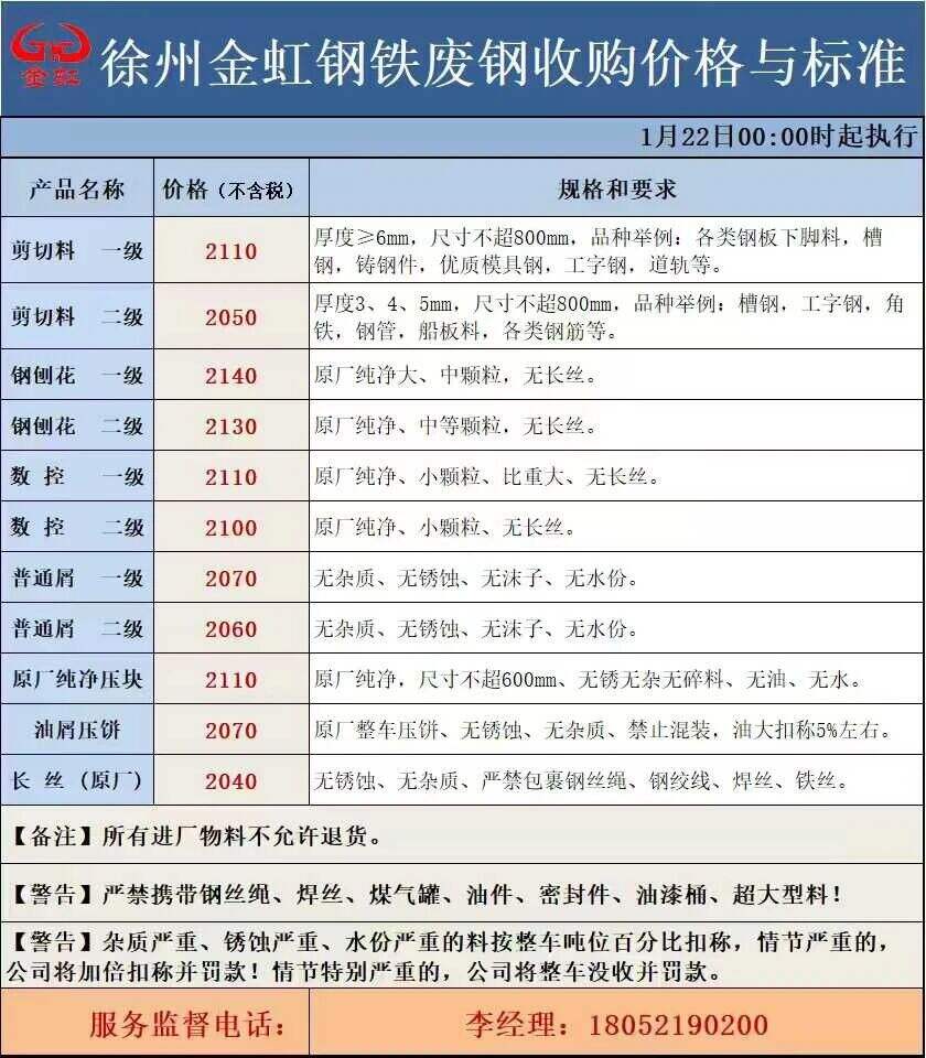 連云港亞新通知:*月**日廢鋼價格上調(diào)**元/噸:一、**毫米厚新鋼板料,模具鋼,價****元;二、*毫米厚度以上鍛打毛邊,價****-****元;三、重廢A,價****元;四、*毫米厚重廢B,價****元;五、*毫米厚中廢新料,價****-****元。*毫米厚度以下拒收,車面與車底等級不一,按摻假處理。規(guī)格:**X**。超長度需重新加工:(*)占**%以上扣**元/噸(*)占**%以上扣***元/噸(*)化工廠料,帶油料,高硫廢鋼,油漆桶廢鋼一律拒收。所有密封容器(如:千斤頂,汽車液壓頂,各類氣瓶,罐,密封管件等),必須徹底切斷處理,如未徹底切斷,重罰*****元以上/件。