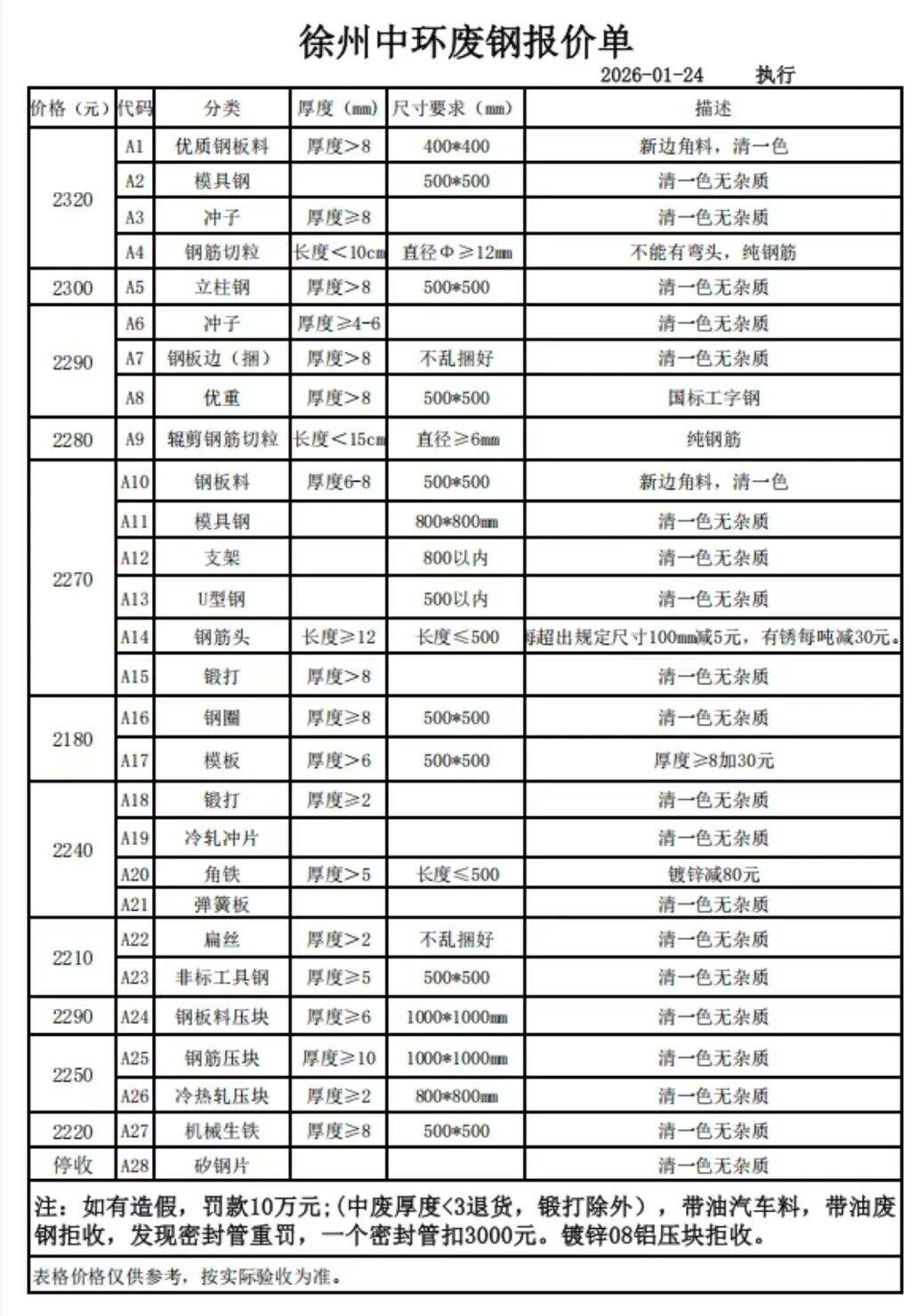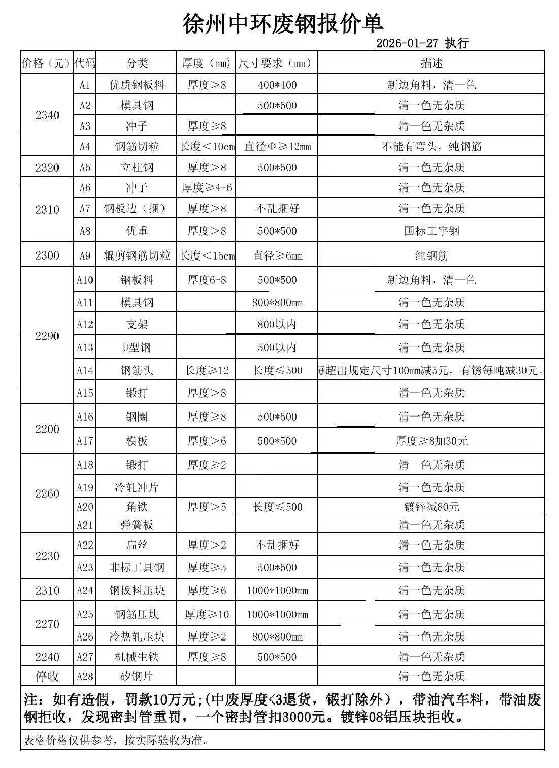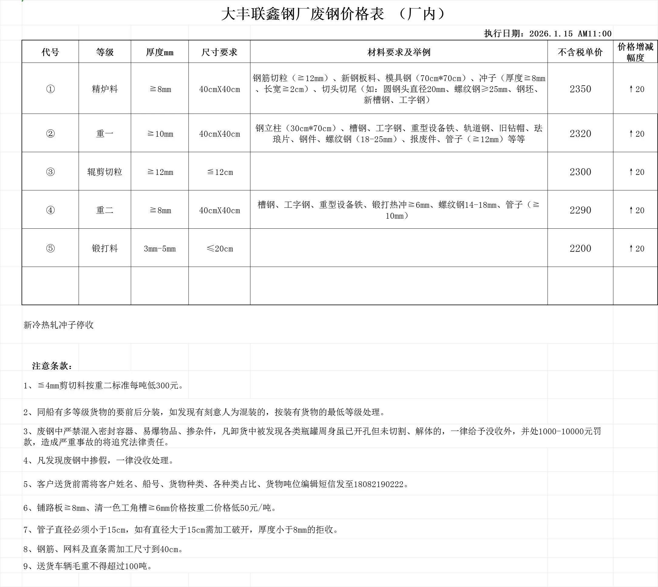連云港亞新通知:*月**日廢鋼價格上調(diào)**元/噸:一、**毫米厚新鋼板料,模具鋼,價****元;二、*毫米厚度以上鍛打毛邊,價****-****元;三、重廢A,價****元;四、*毫米厚重廢B,價****元;五、*毫米厚中廢新料,價****-****元。*毫米厚度以下拒收,車面與車底等級不一,按摻假處理。規(guī)格:**X**。超長度需重新加工:(*)占**%以上扣**元/噸(*)占**%以上扣***元/噸(*)化工廠料,帶油料,高硫廢鋼,油漆桶廢鋼一律拒收。所有密封容器(如:千斤頂,汽車液壓頂,各類氣瓶,罐,密封管件等),必須徹底切斷處理,如未徹底切斷,重罰*****元以上/件。