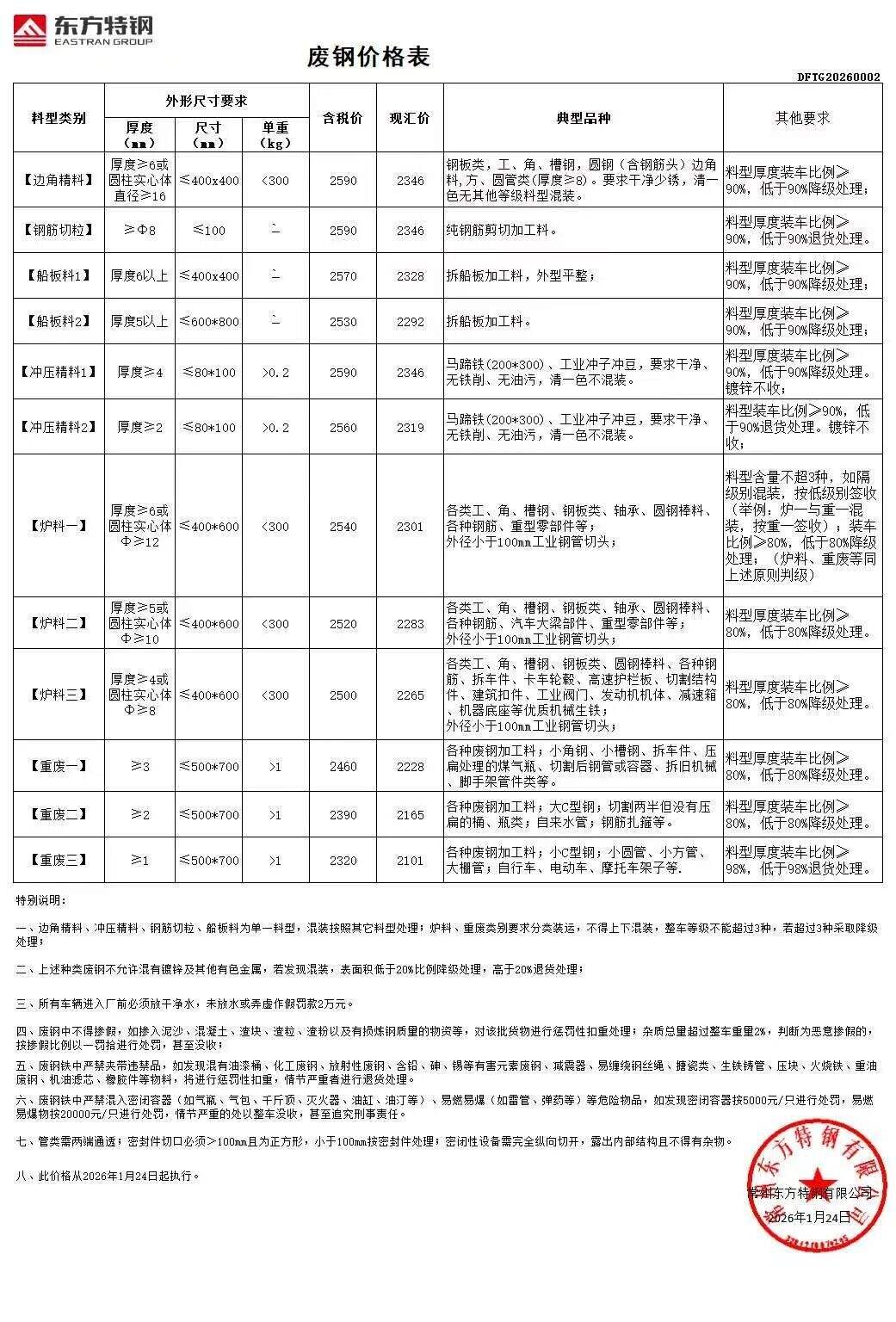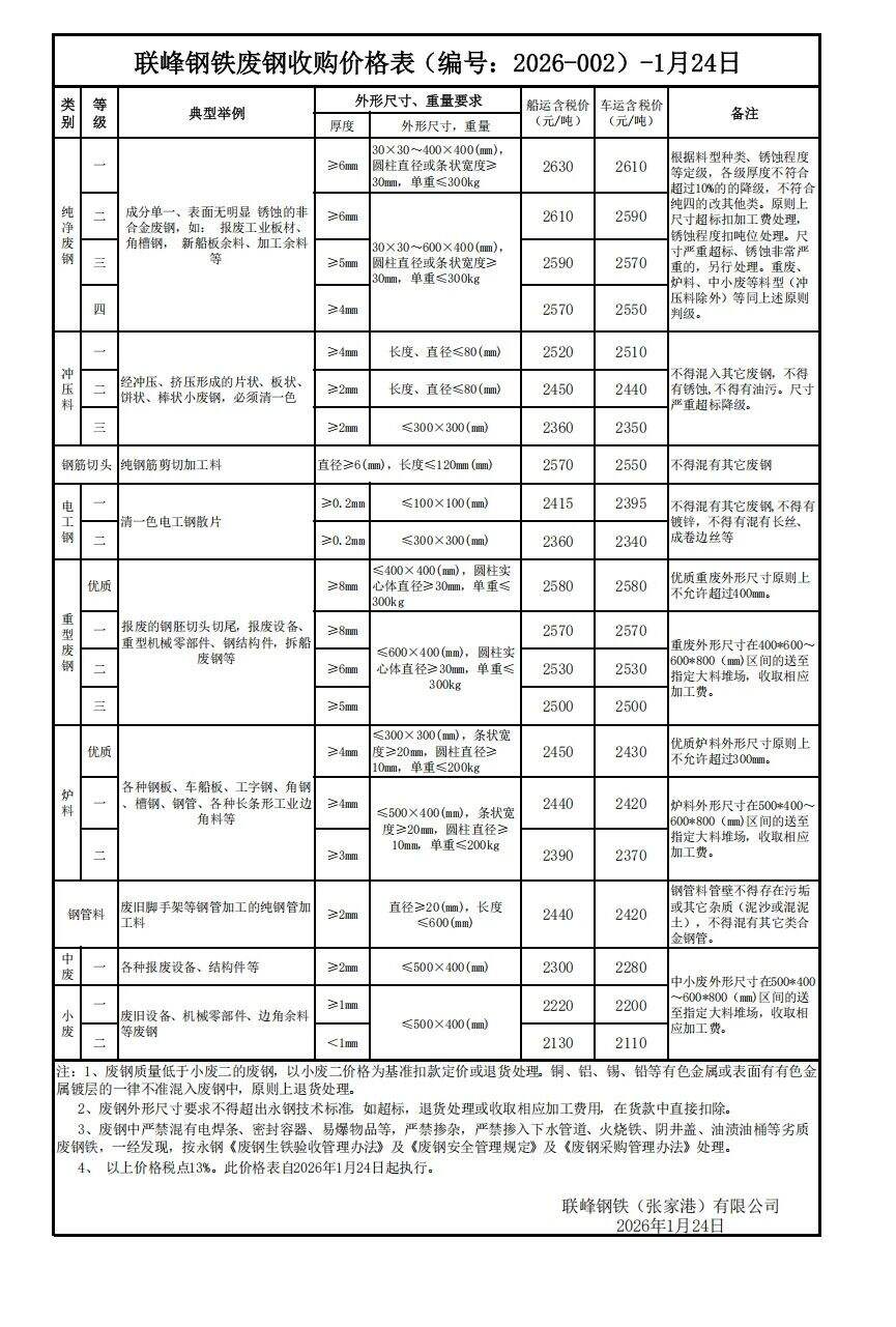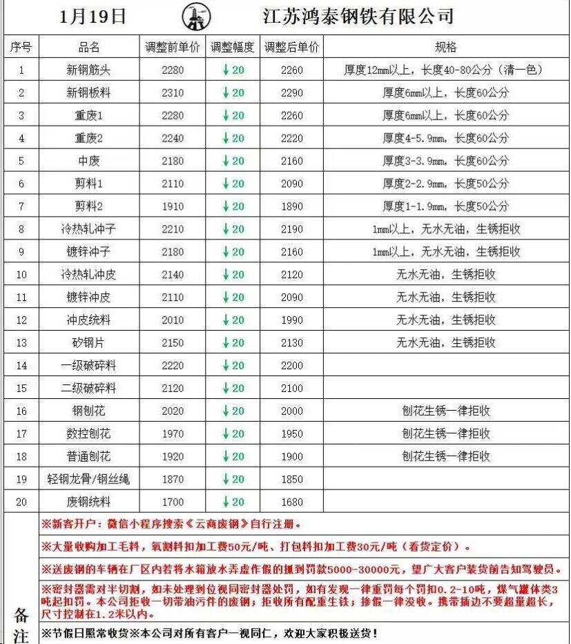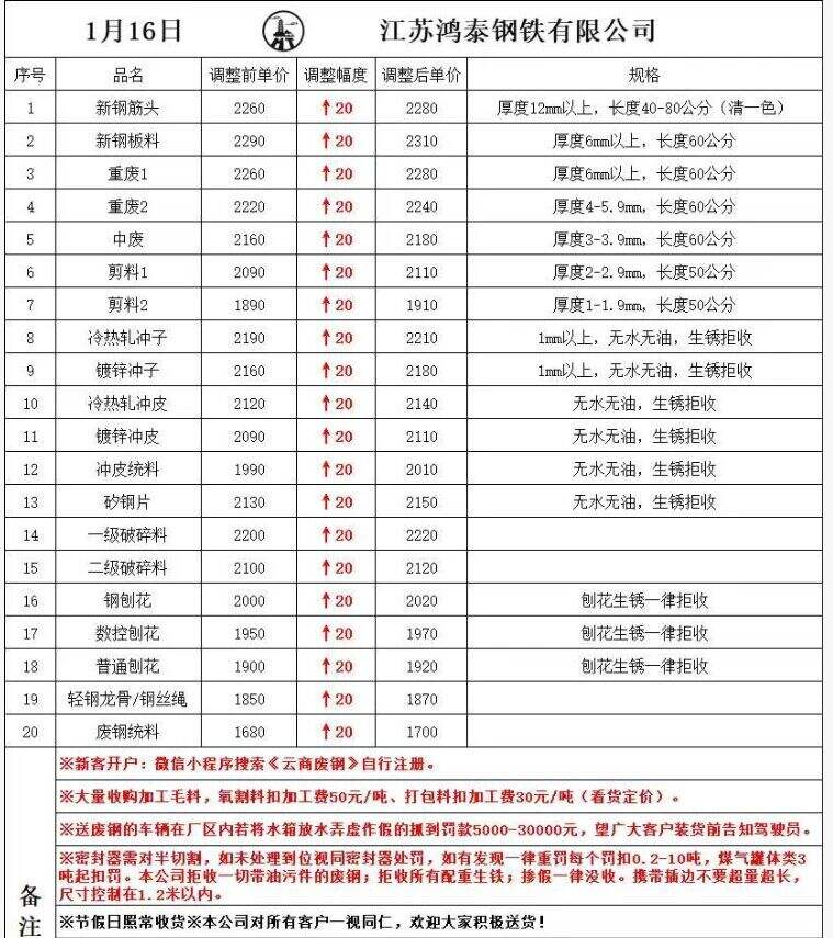 江蘇敬業(yè)基地計劃于****年*月**日**時起含稅價格:廢鋼一類上調(diào)**元/噸,其余不變。鋼板料(*mm)****元/噸,重廢一(**mm)****元/噸,重廢二(*mm)****元/噸,重廢三(*mm)****元/噸,次重廢(*mm)****元/噸,特級破碎料*類****元/噸。