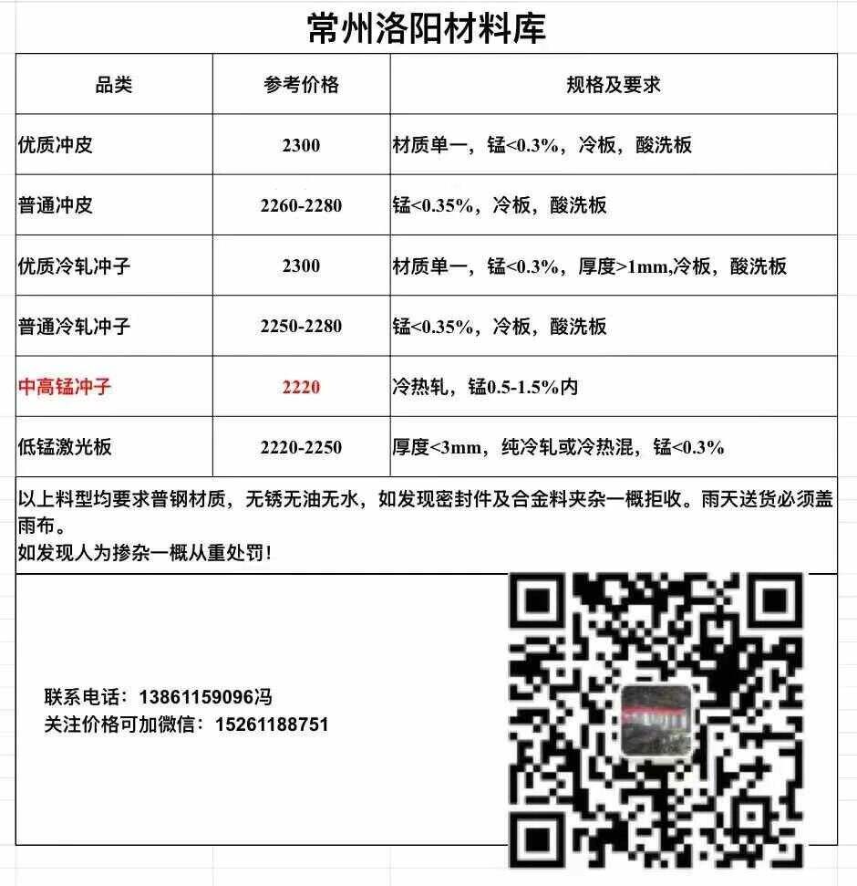 常州洛陽材料庫高價(jià)收購、自提冷板沖皮,鋼板料。收購價(jià):優(yōu)質(zhì)冷板酸洗沖條沖皮最高****,普通低錳冷板酸洗沖條沖皮****-****,低碳低錳沖子****-****,中高錳冷熱沖子****,低錳激光板****-****,聯(lián)系電話***********馮,關(guān)注最新價(jià)格請加微信:***********。地址:江蘇常州武進(jìn)洛陽鎮(zhèn)創(chuàng)盛路*號(hào)