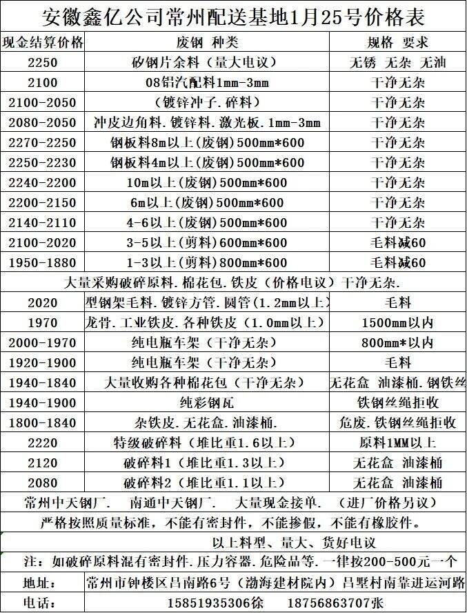 揚(yáng)州鴻藍(lán)鋼鐵:收購冷板,熱板打包料,激光板厚度*個(gè)以下,價(jià)格****-****, 激光板,冷熱板,沖料(沒有油漆,鍍鋅)*-*個(gè)厚:****-**** ,*個(gè)以上厚度****-****,純沖子,沖豆**** 重廢****-****, 鍍鋅鐵皮:****-**** 剪料*-*厚****-**** 大量高價(jià)收購各種雜廢鋼,按貨定價(jià)。當(dāng)日付款降**元每噸!月底付款加**一噸!歡迎新老客戶聯(lián)系! 收購電話***********徐,微信同步, 地址:邗江區(qū)槐泗鎮(zhèn)肖胡村肖胡路*號(hào)(位置:揚(yáng)州鴻藍(lán)鋼鐵加工有限公司)
