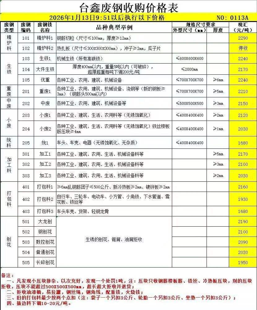 方大特鋼廢鋼自****年*月**起:散料廢鋼上調**元/噸,鋼筋壓塊上調**元/噸,邊角料壓塊*上調**元/噸,邊角料壓塊*上調**元/噸,邊角料壓塊*上調**元/噸,A級社會壓塊上調**元/噸,A*級社會壓塊上調**元/噸,普通壓塊上調**元/噸,B級社會壓塊上調**元/噸,打包廢鋼壓塊上調**元/噸,打包廢鋼壓塊*上調**元/噸,汽車殼壓塊上調**元/噸,汽車輪胎絲上調**元/噸,一級廢鋼壓塊上調**元/噸,二級廢鋼壓塊上調**元/噸,其他料型不變。
