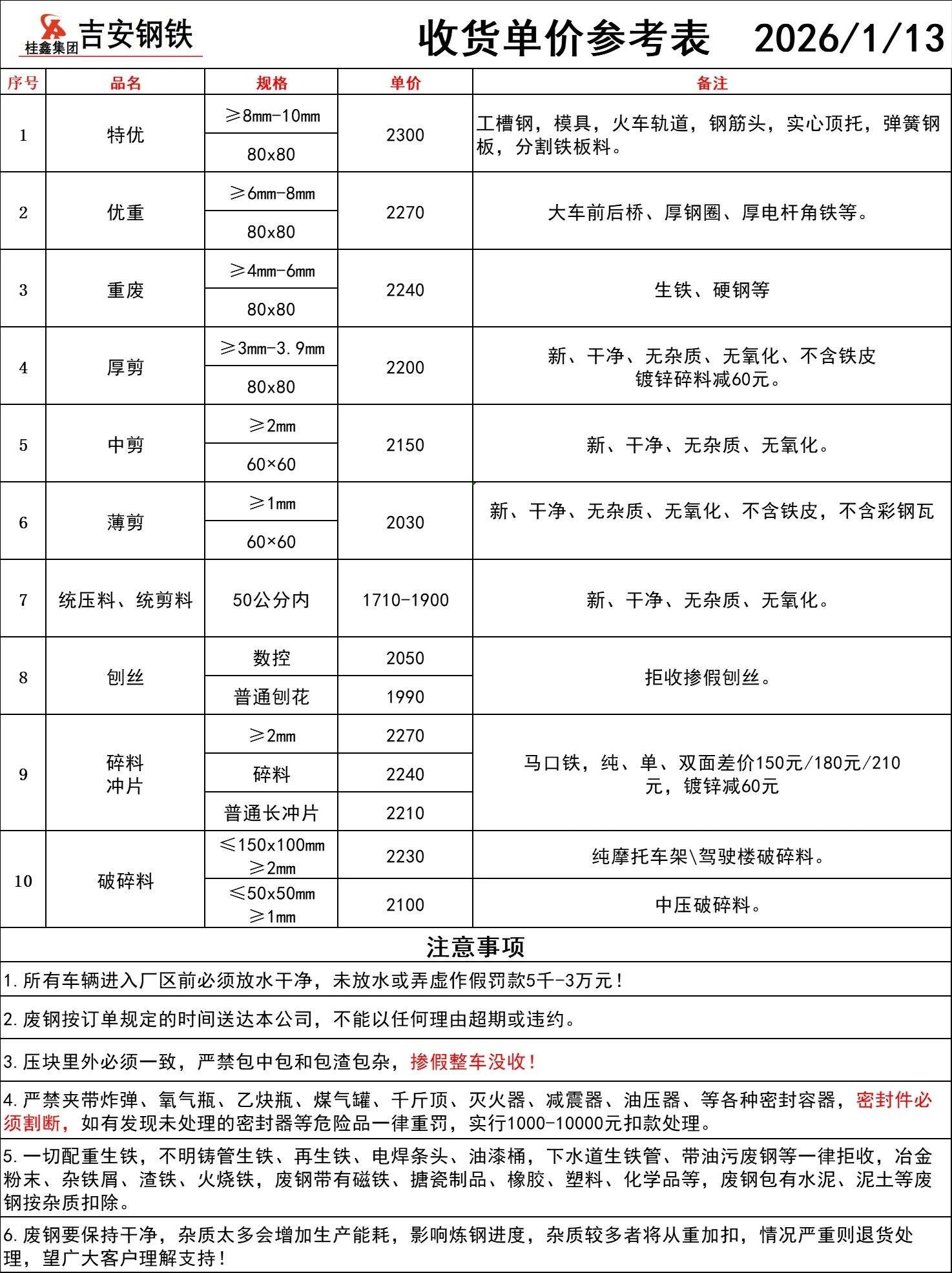 湖口宏鑫(九江萍鋼一手合同戶)****年*月**日價格調整如下:*;鋼筋壓塊:*****;冷熱軋壓塊*、邊角料壓塊一;*****;冷熱軋壓塊*、邊角料壓塊二;*****;普通壓塊:*****;巖棉壓塊:*****;汽車輪胎絲:*****;一級廢鋼壓塊:*****;二級廢鋼壓塊;****所有扣雜判檢以鋼廠為準,有弄虛作假,沒收,罰款等情況由客戶自行承擔。