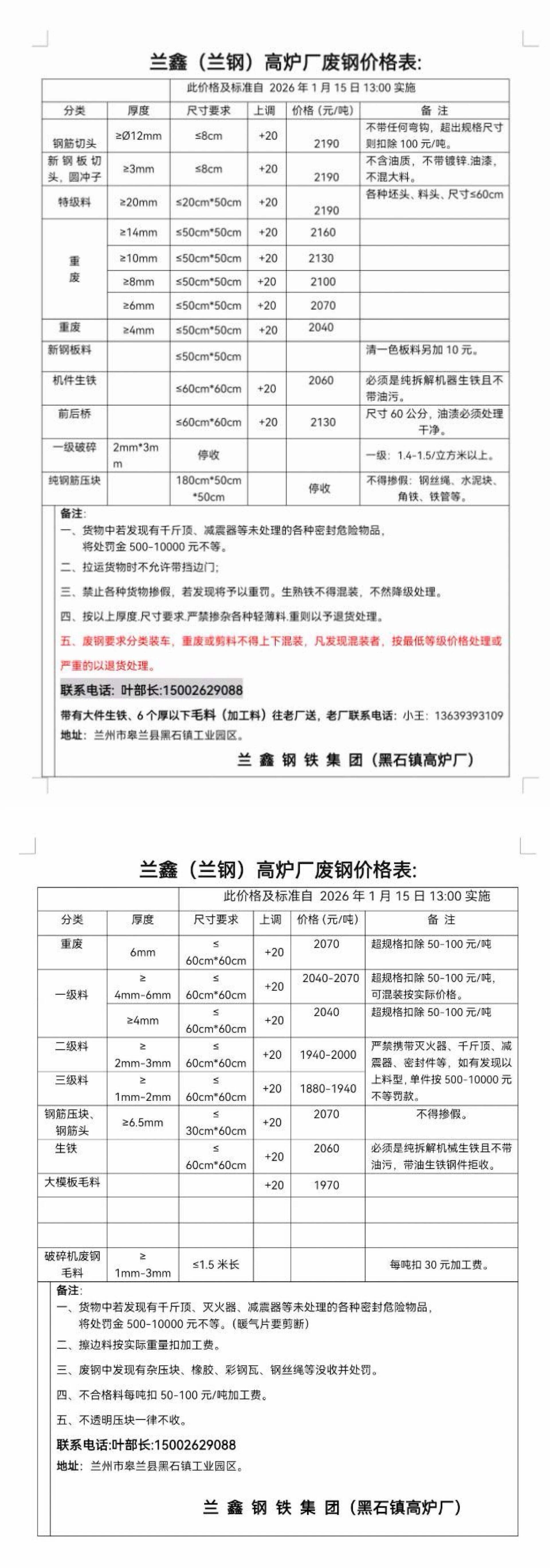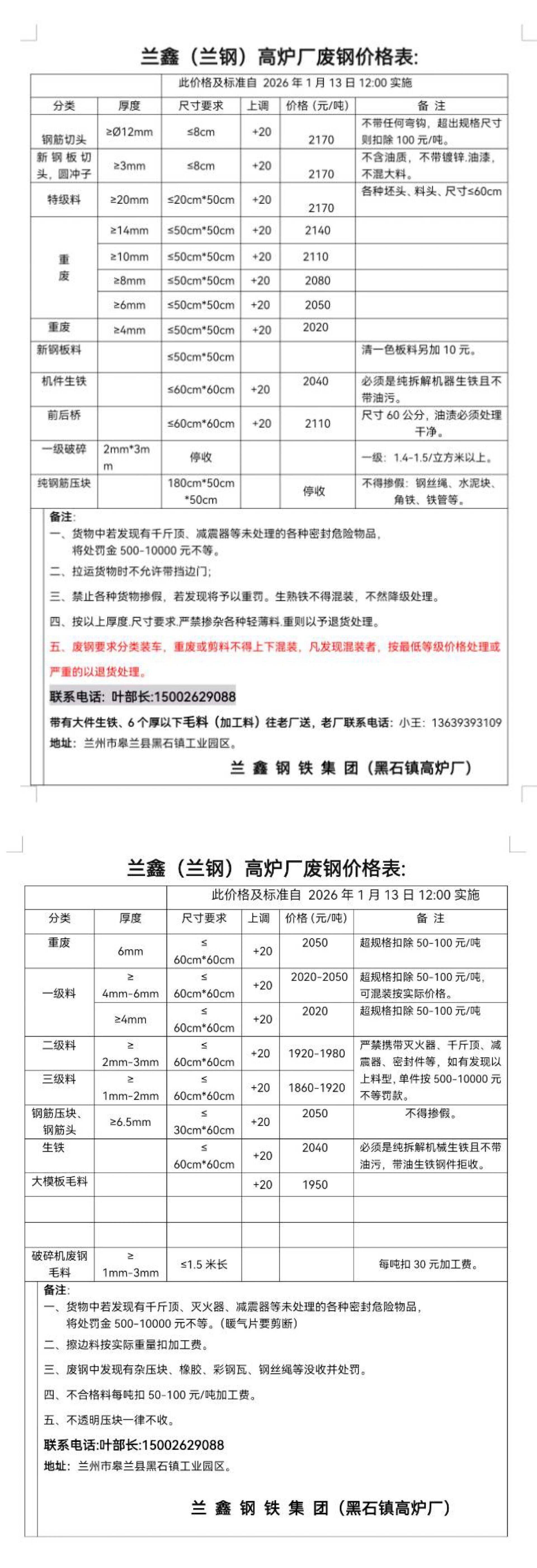 蘭鑫**月**日*:**重廢、剪料價格上調(diào)**元/噸。