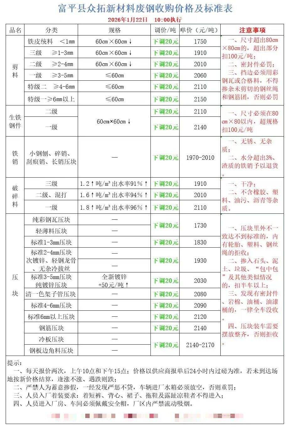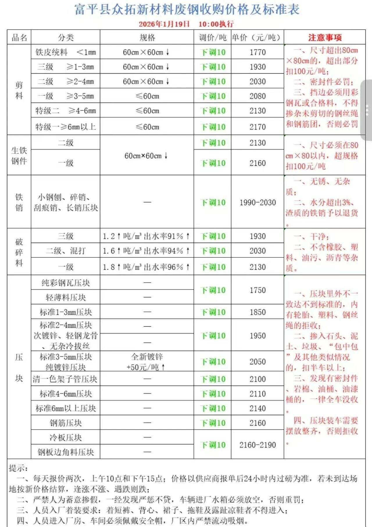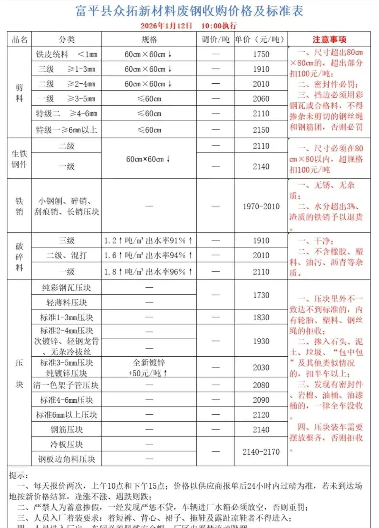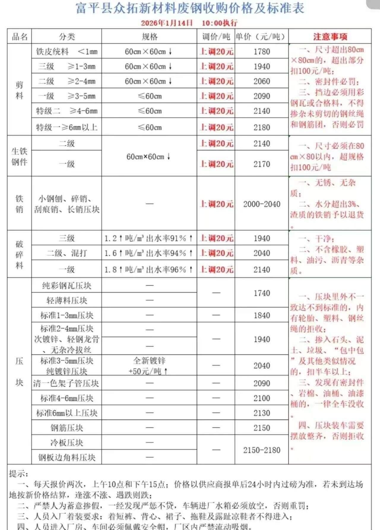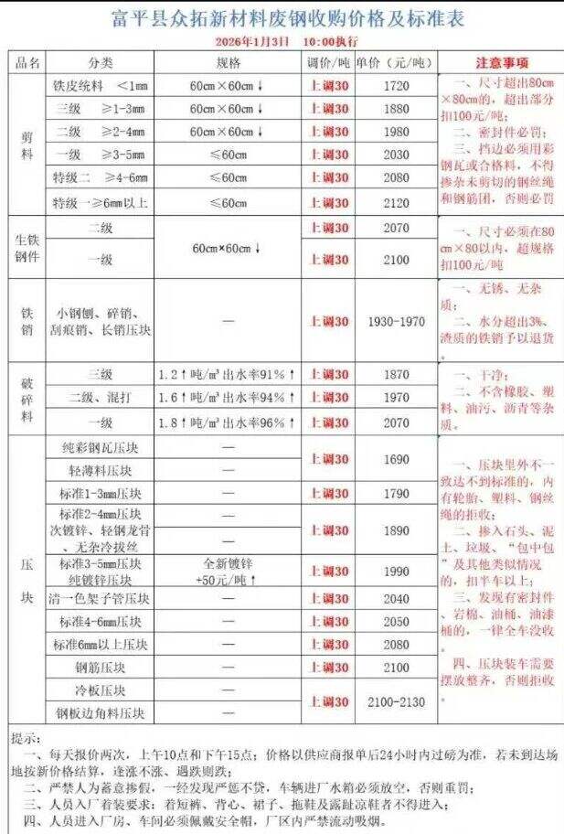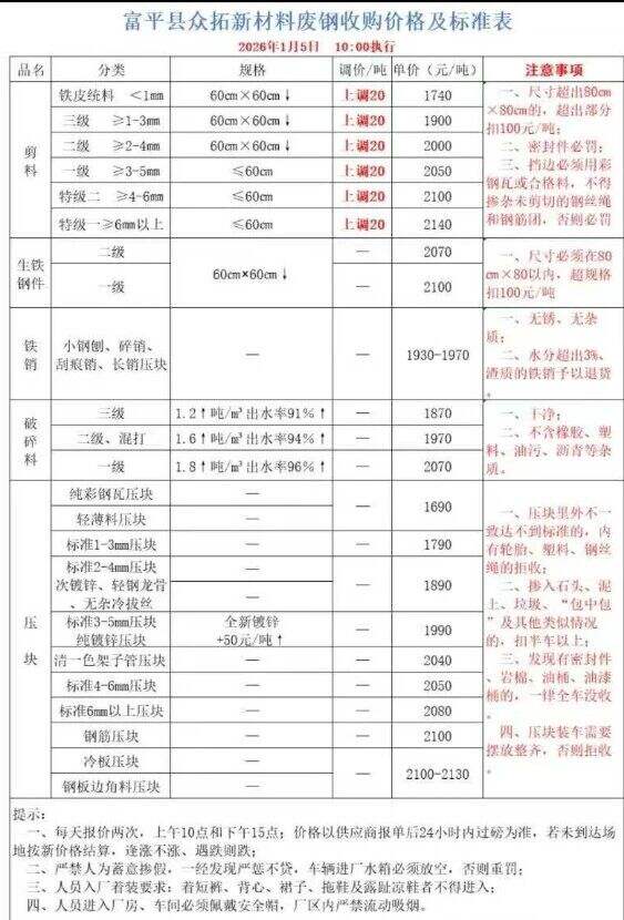****年*月*日富平縣眾拓新材料廢鋼收購價格及標準表上調(diào)