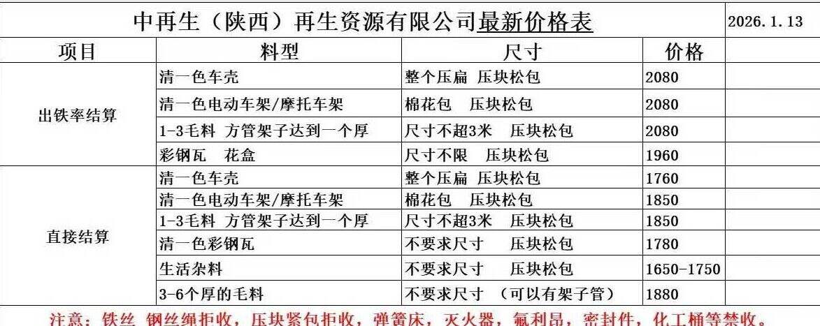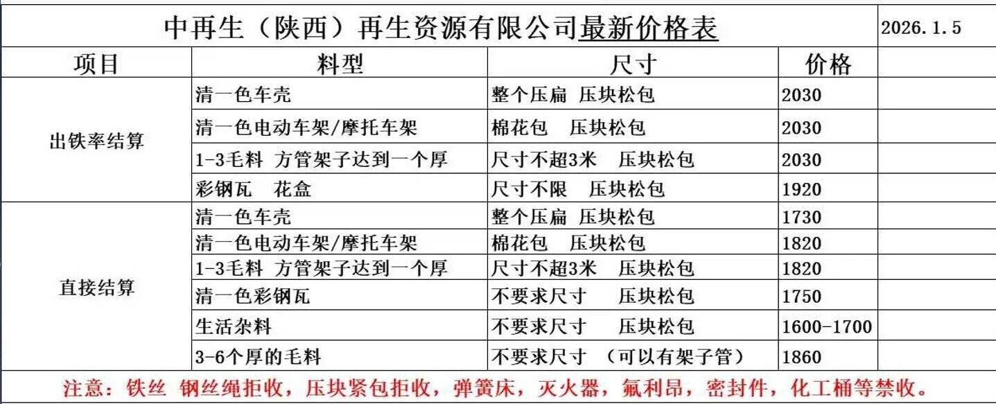 ****年*月*日中再生(陜西)再生資源有限公司最新價格表