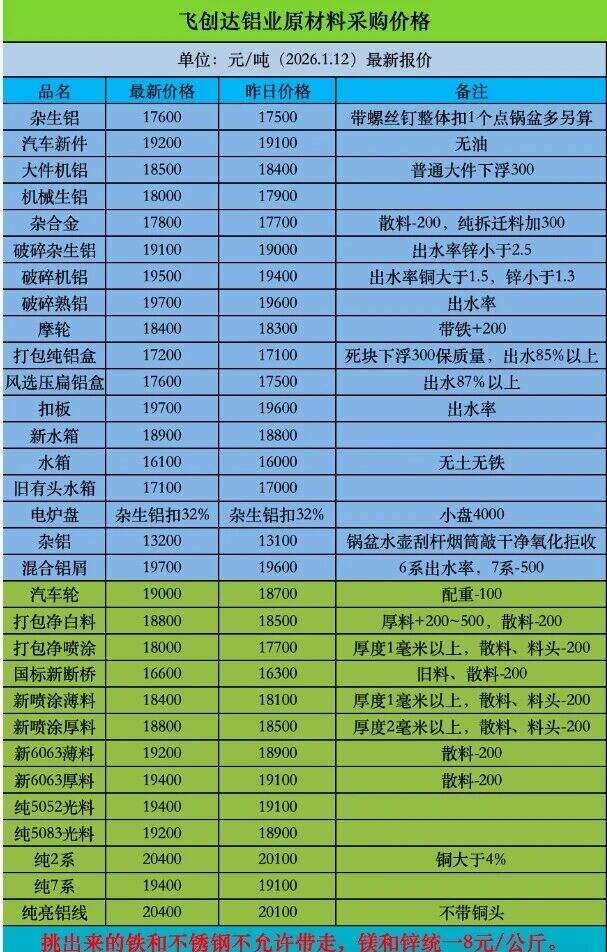 ****年*月*日飛創(chuàng)達鋁業(yè)原材料采購價格